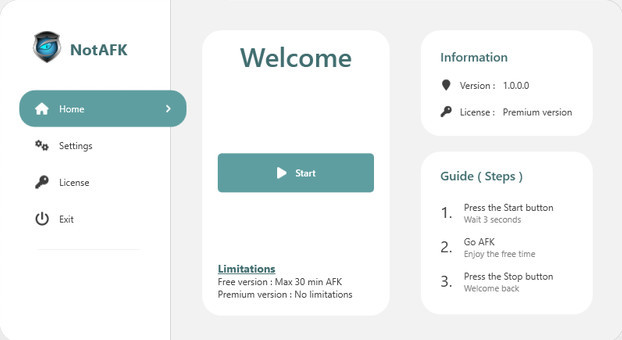 NotAFK využívá umělou inteligenci (AI), která napodobuje běžné chování uživatele. Bezplatná DEMO verze programu podporuje udržování aktivního stavu po dobu maximálně 30 minutových intervalů.