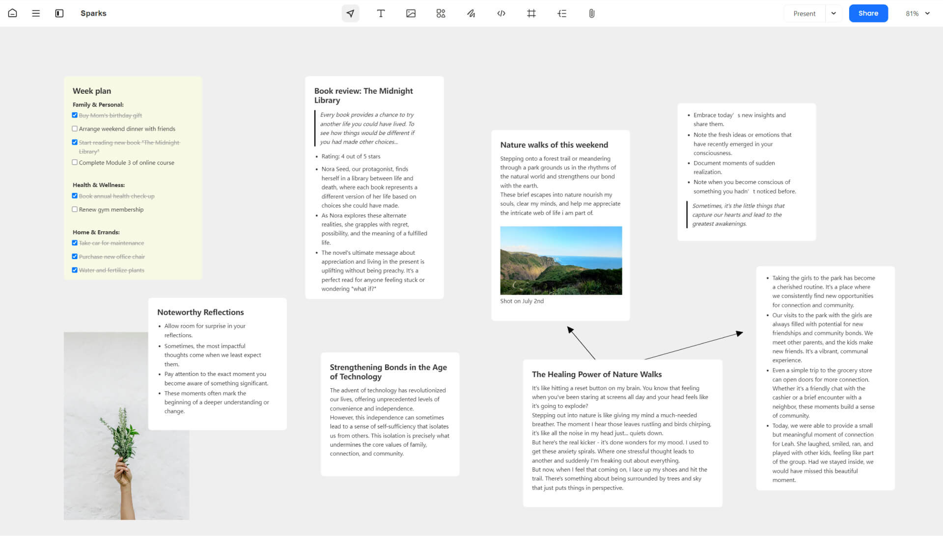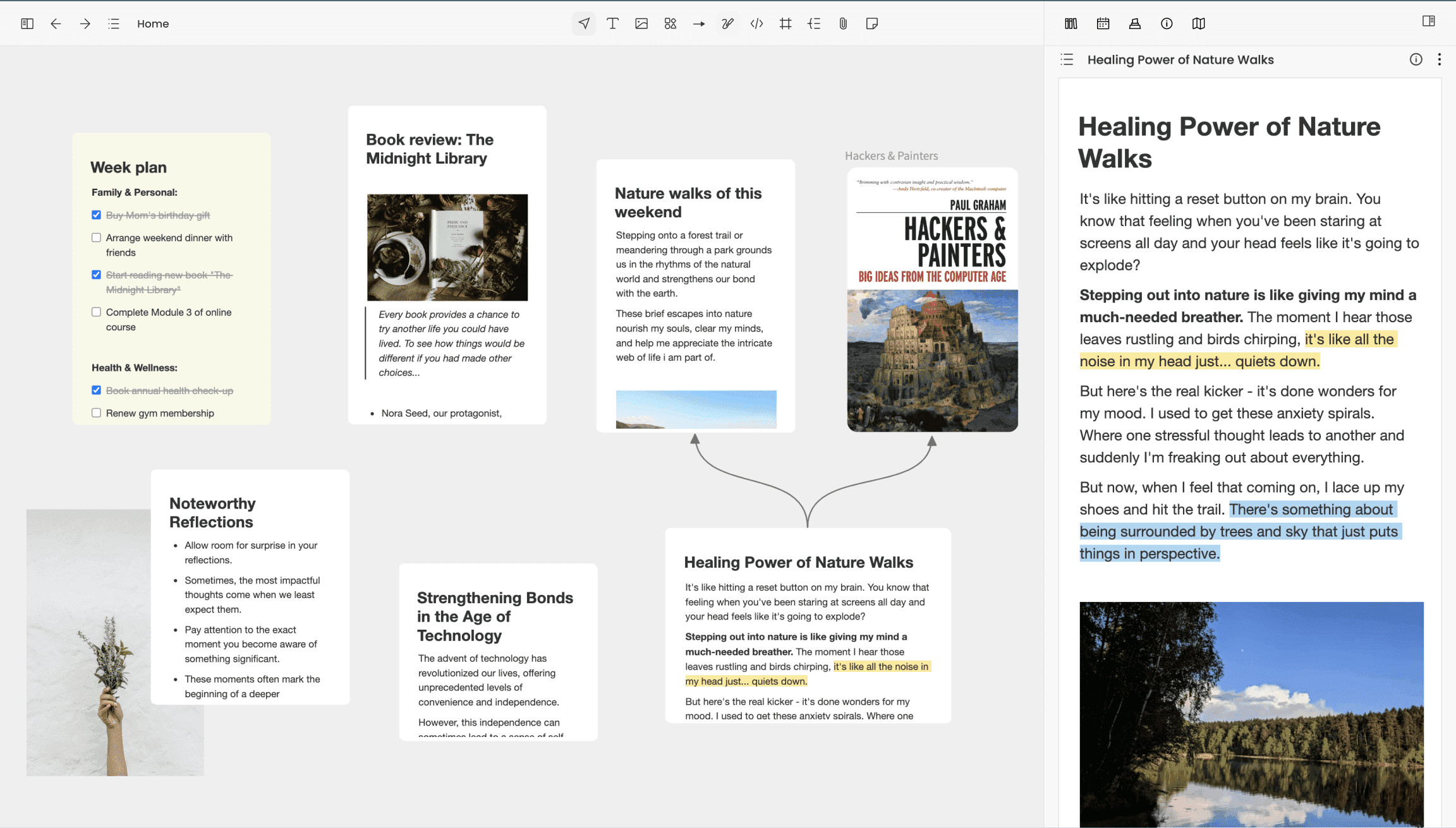 Noteey také nabízí nekonečné plátno pro vložení myšlenek, interaktivní propojení obsahu, tvorbu poznámek z videí a užitečné kreslicí nástroje pro vytváření náčrtů, diagramů a vývojových diagramů.