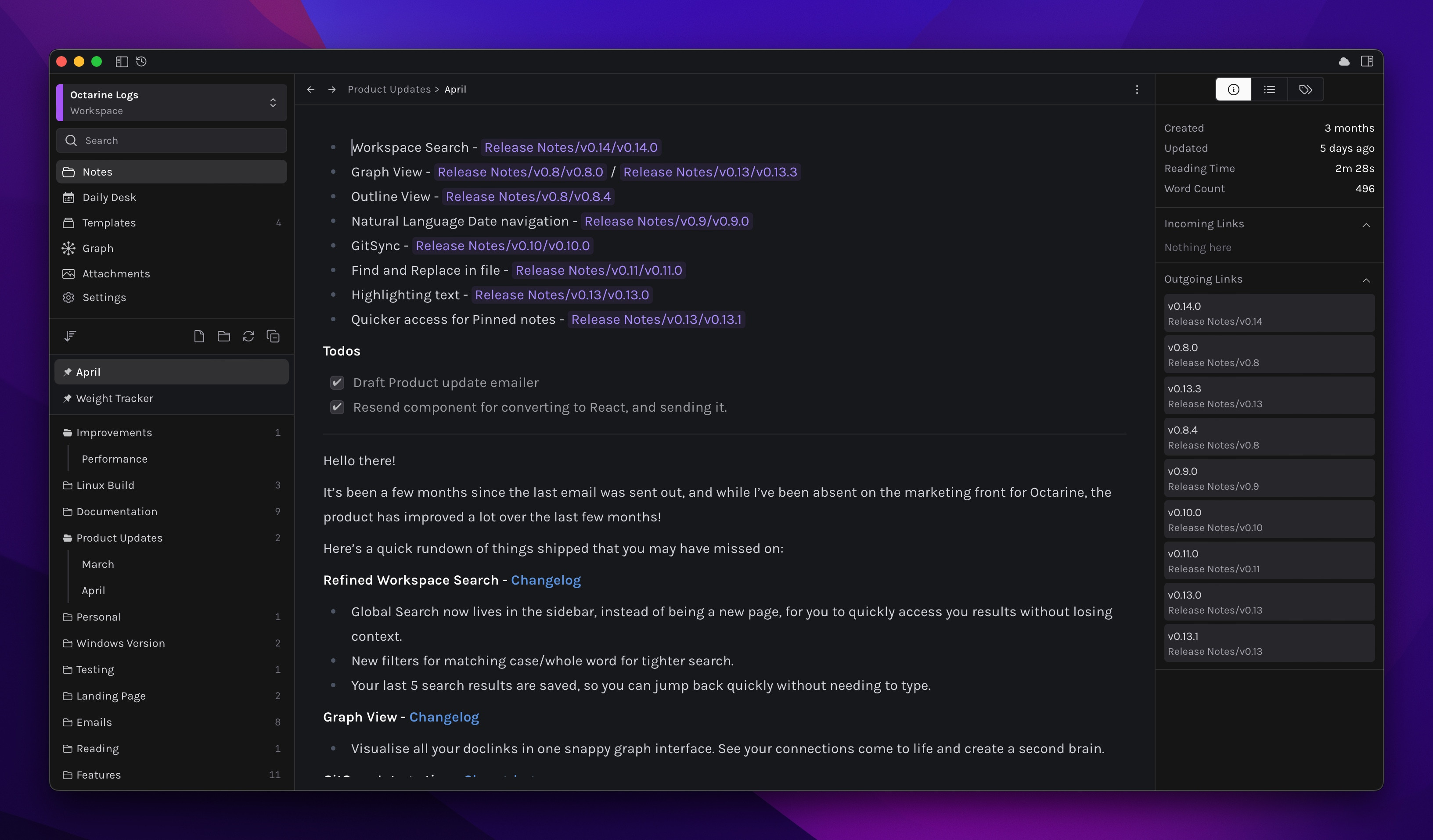 Octarine for Mac je pomocník pro přehlednou a pokročilou správu různých poznámek s podporou Markdown syntaxe. Nechybí ani možnost zapisování a vykreslování matematických vzorců pomocí integrovaného editoru. Možné je také vzájemné propojení poznámek, vedení vlastního deníku, rychlé vyhledávání v textu a podporováno je také ovládání pomocí klávesových zkratek.