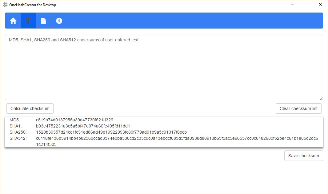 One Hash Creator je aplikace pro výpočet kontrolních součtů u souborů nebo vloženého textu. Podporován je výpočet kontrolních součtů typu MD5, SHA-1, SHA2-256 nebo SHA2-512. Zjištěné součty lze uložit do TXT souboru. Program nevyžaduje instalaci.