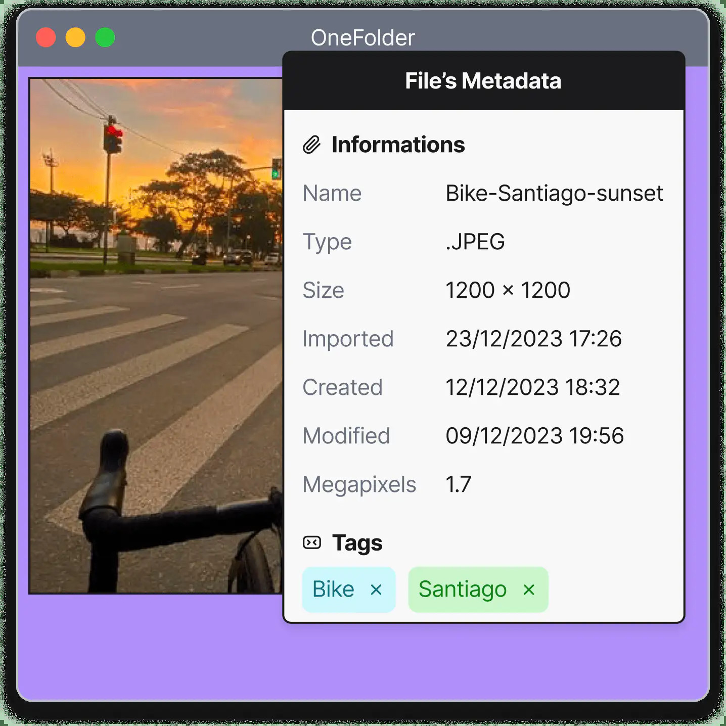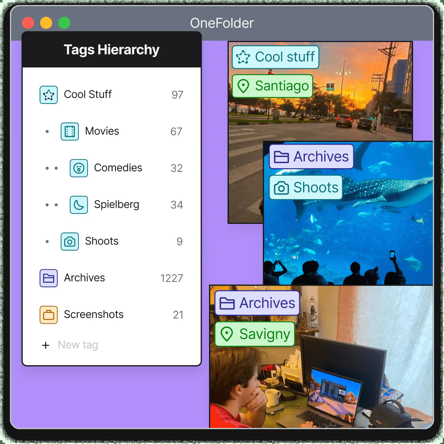 OneFolder je nástroj pro správu a automatizaci činností s digitálními fotografiemi a videi přímo v příslušných složkách. Program pro svou činnost nevyžaduje. Všechny soubory (obrázky i videa) zůstávají standardními soubory bez uzamčení do databází nebo proprietárních formátů. Metadata jsou pak čtena a zapisována ve standardních formátech EXIF nebo XMP