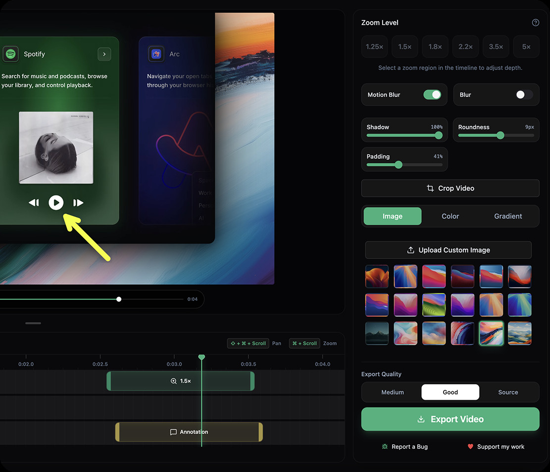 Open Screen je profesionální aplikace sloužící pro snímání obrazovky a tvorbu pěkných produktových demo videí, prezentačních materiálů nebo ukázek software. Samozřejmostí je možnost využití zajímavých efektů, využití plynulého zoomování, přiblížení kurzoru, zvýraznění aktivních oblastí, překryvné anotace nebo vizuálně konzistentní pozadí. Podporována je i práce s více připojenými monitory