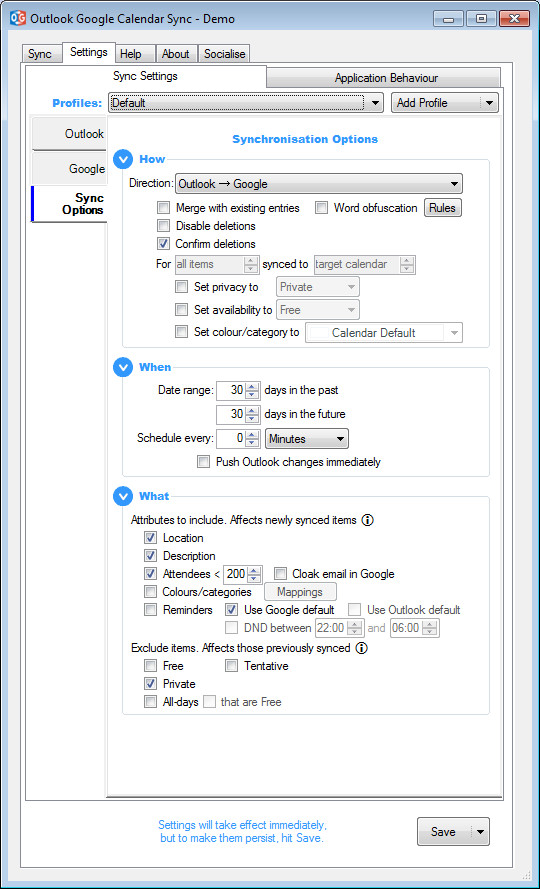 Outlook Google Calendar Sync je nástroj umožňující vzájemnou synchronizaci obsahu kalendářů Outlook a Google. Provádět lze obousměrnou synchronizaci událostí, včetně případných účastníků a poznámek. Při nastavení je možné vyloučit ze synchronizace vybrané položky kalendáře na základě dostupnosti, soukromí, názvy nebo barvy položky. Nástroj využívá rozdílového porovnání pro aktualizaci pouze těch atributů, které se změnily. Nastavit lze samozřejmě také frekvenci synchronizace kalendářů.
