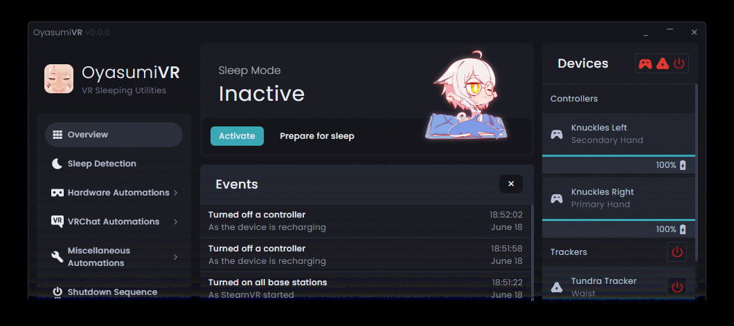 OyasumiVR je nástroj určený pro uživatele platformy virtuální reality VRChat, kteří praktikují tzv. VR spánek, tj. spánek s nasazeným VR (Virtual Reality) headsetem. Hlavním úkolem nástroje je automatizovat a optimalizovat různé aspekty tohoto zážitku, aby byl co nejpohodlnější a energeticky efektivní.