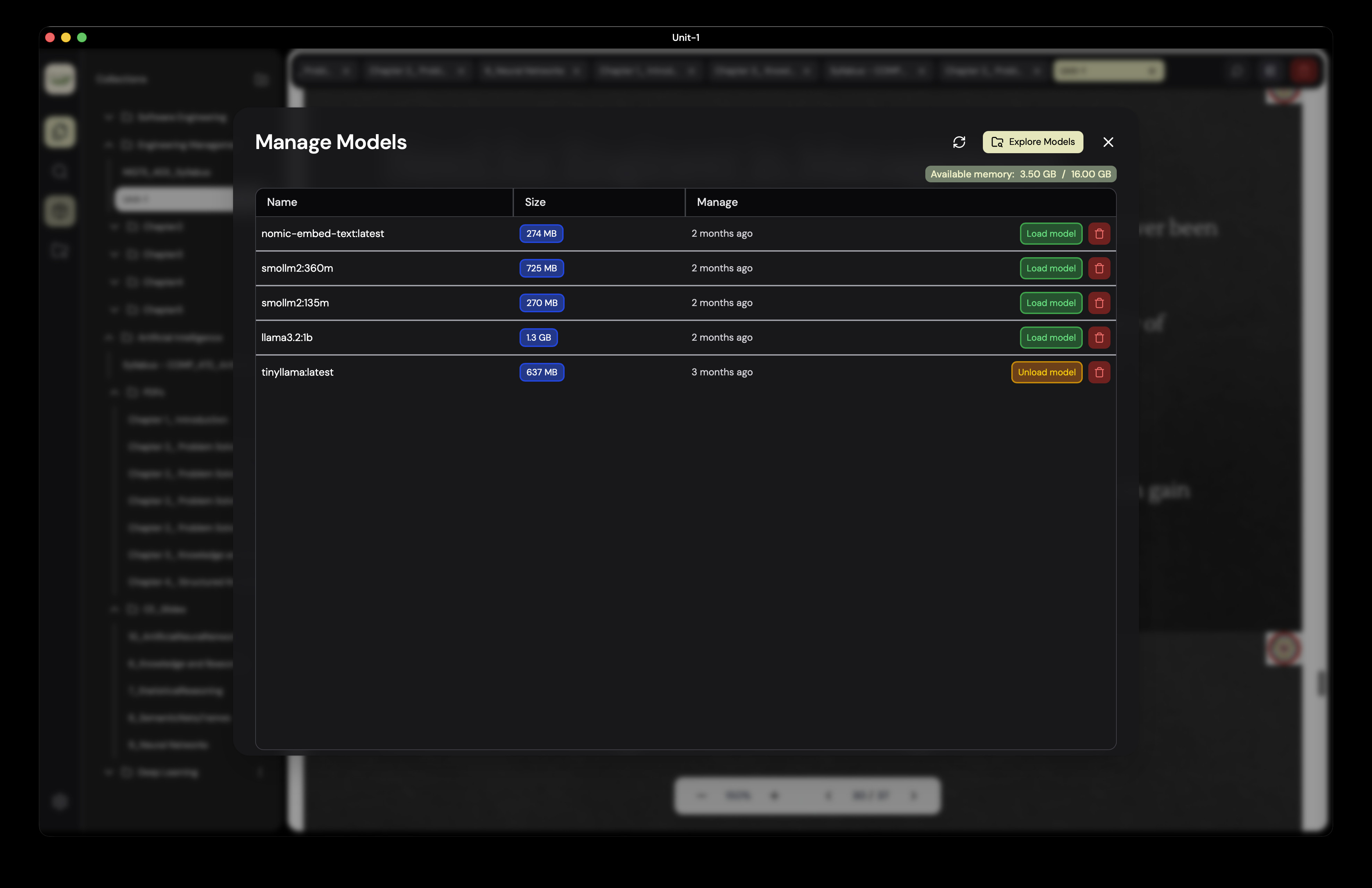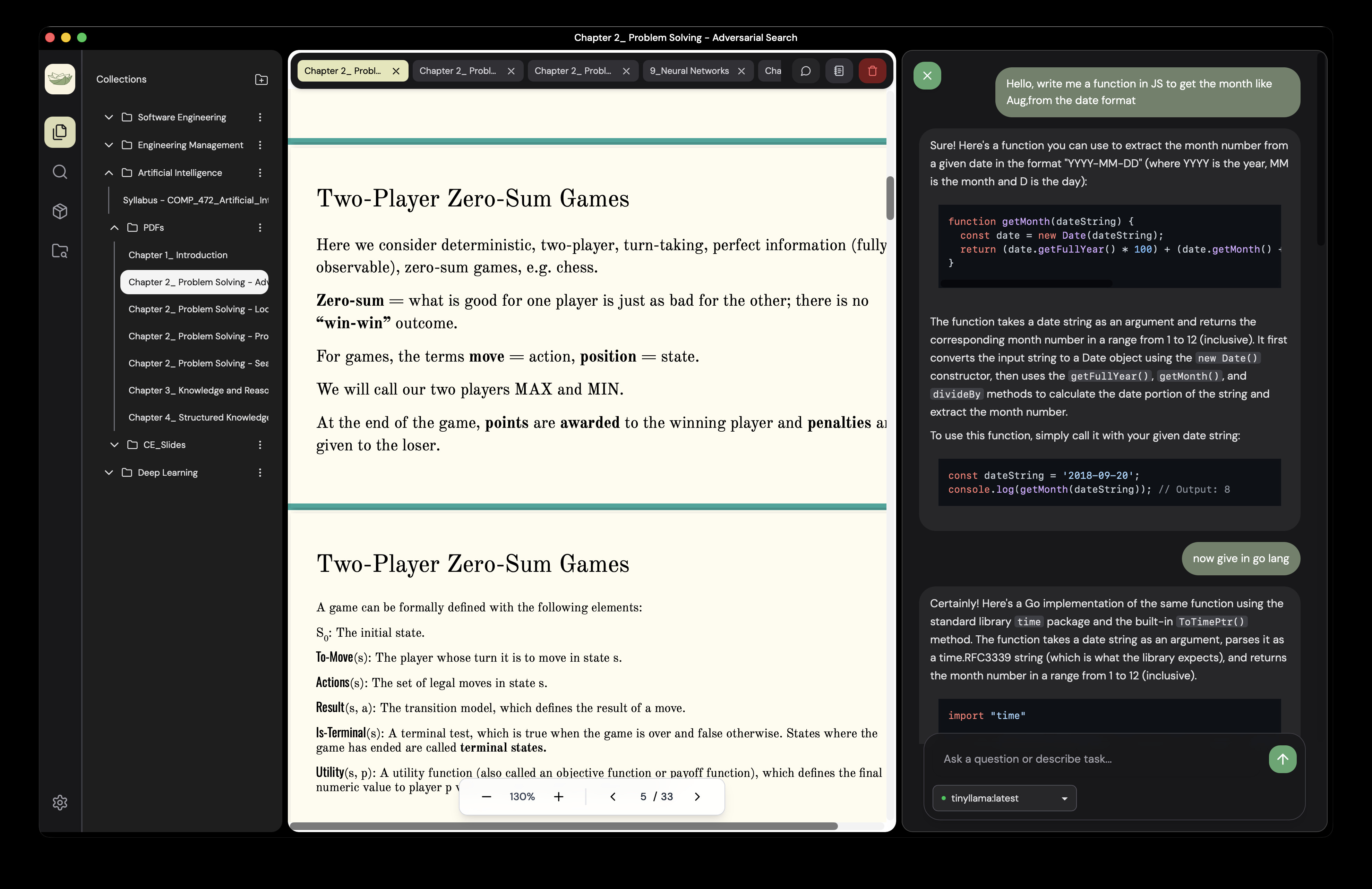 PaperNest podporuje integraci s LLM Ollamu, díky níž lze pak chatovat přímo nad obsahem dokumentu nebo obecně. Veškeré AI zpracování pak probíhá s lokálními modely a data nejsou odesílána nikam na server nebo do cloudu. Poznámky se pak ukládají do lokální databáze SQLite.