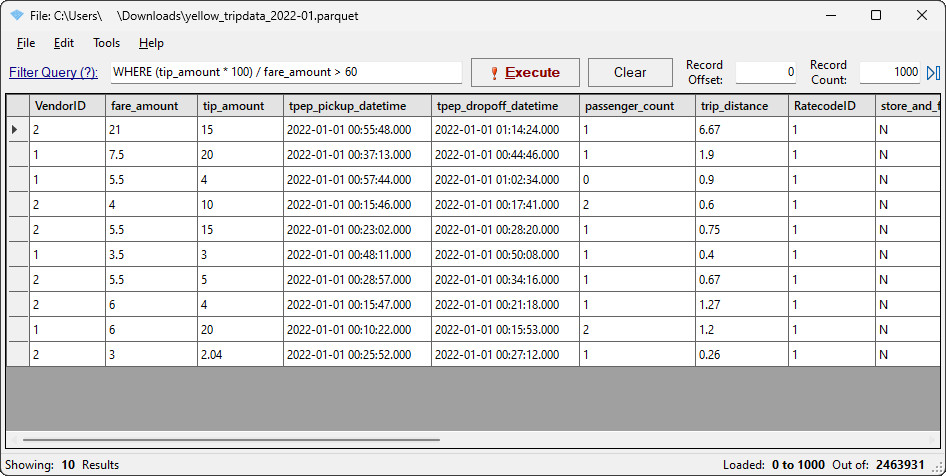 ParquetViewer dokáže snadno zobrazit a prozkoumávat obsah Parquet souborů bez nutnosti tvorby skriptů nebo použití složitých analytických nástrojů. Podporováno je filtrování dat v souboru a hledání specifických záznamů.