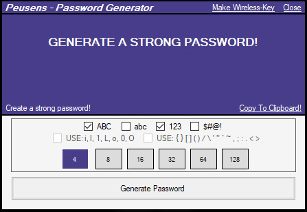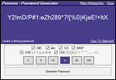 Password Generator je nenáročný a snadno ovladatelný nástroj pro snadné a rychlé generování bezpečných hesel na základě zadaných kritérií. Uživatel může definovat, zda bude heslo obsahovat velká či malá písmena, číslice nebo speciální znaky. Program není potřeba instalovat.