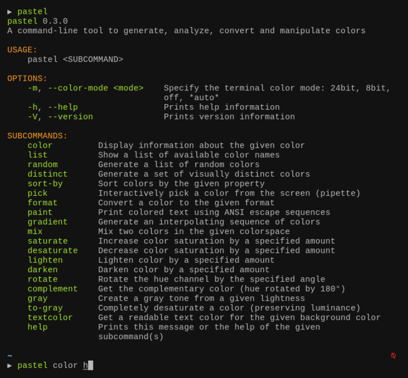 pastel jen nástroj ovládaný pomocí příkazového řádku, který slouží pro generování, analýzu, převod a manipulaci s barvami. Podporovány jsou barevné odstíny ve formátech RGB (sRGB), HSL, CIELAB, CIELCh a také ANSI 8-bit nebo 24-bit. Možný je také výběr barevného odstínu pomocí funkce "color picker", návrh barevných odstínů a mixování barev.