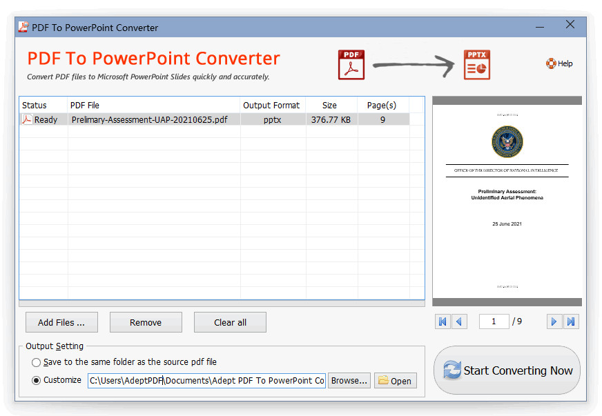 PDF to PowerPoint Converter je nástroj sloužící pro převod PDF souborů do prezentací typu PowerPoint. Exportovat respektive převádět lze velý obsah PDF dokumentů včetně textu, obrázků, grafů a dalšího obsahu. Zachován je i celkových vzhled a formátování původního PDF dokumentu.