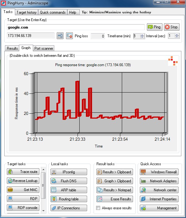 PingHurry je přehledné grafické rozhraní pro provádění příkazu PING, který zjišťuje rychlost odezvy serverů. K dispozici je přehledná historie testovaných serverů, vyhodnocení ve formě 2D i 3D grafů a mnoho dalších užitečných funkcí.