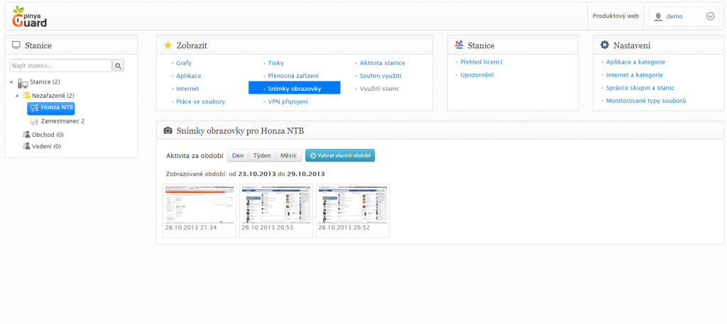 Monitorovací software Pinya Guard zaznamenává kompletní historii všech navštívených webových stránek a umožňuje snímat tzv. screenshoty, snímky obrazovky s možností vložení časového údaje, dle zvoleného klíčového slova a v požadovaných intervalech.