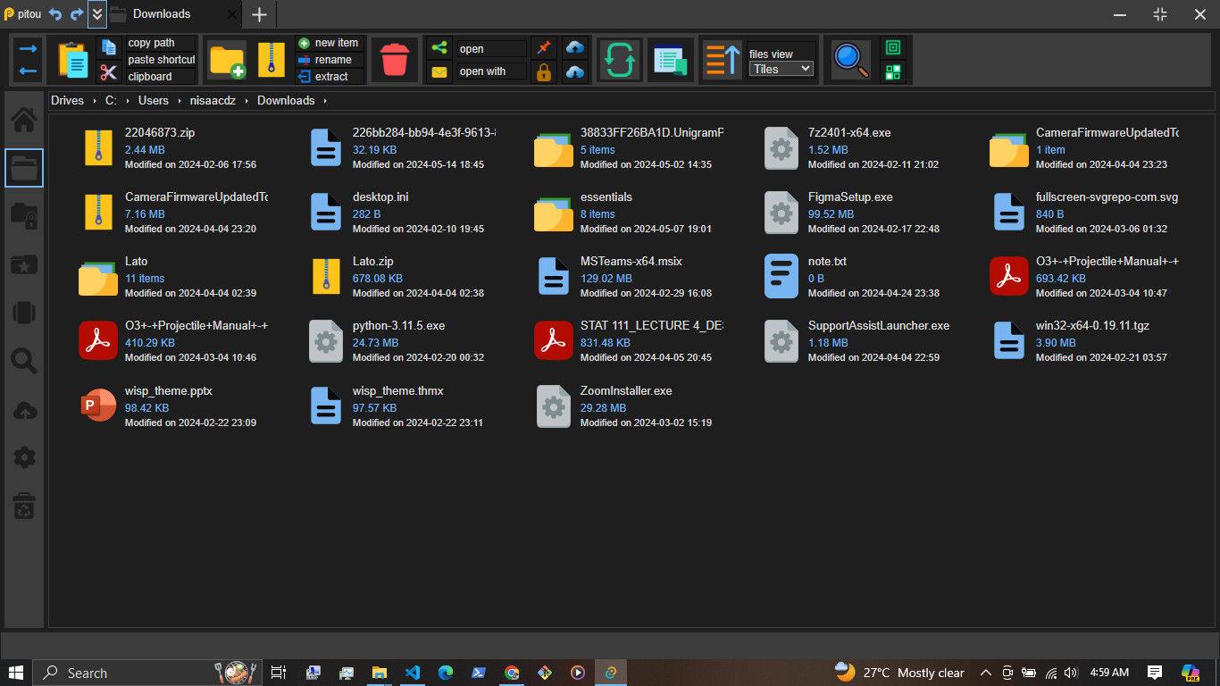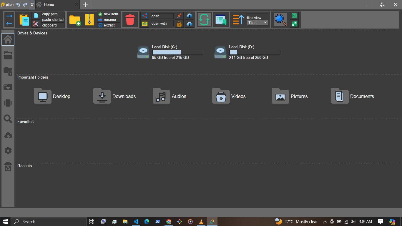 Pitou je přehledný správce souborů, který může sloužit jako zajímavá alternativa klasického Průzkumníka. Zobrazuje jednotlivé disky v počítači i připojená velkokapacitní zařízení, důležité složky (např. plocha, stažené soubory, hudba, videa, obrázky, dokumenty,...), oblíbené složky i naposledy použité složky.