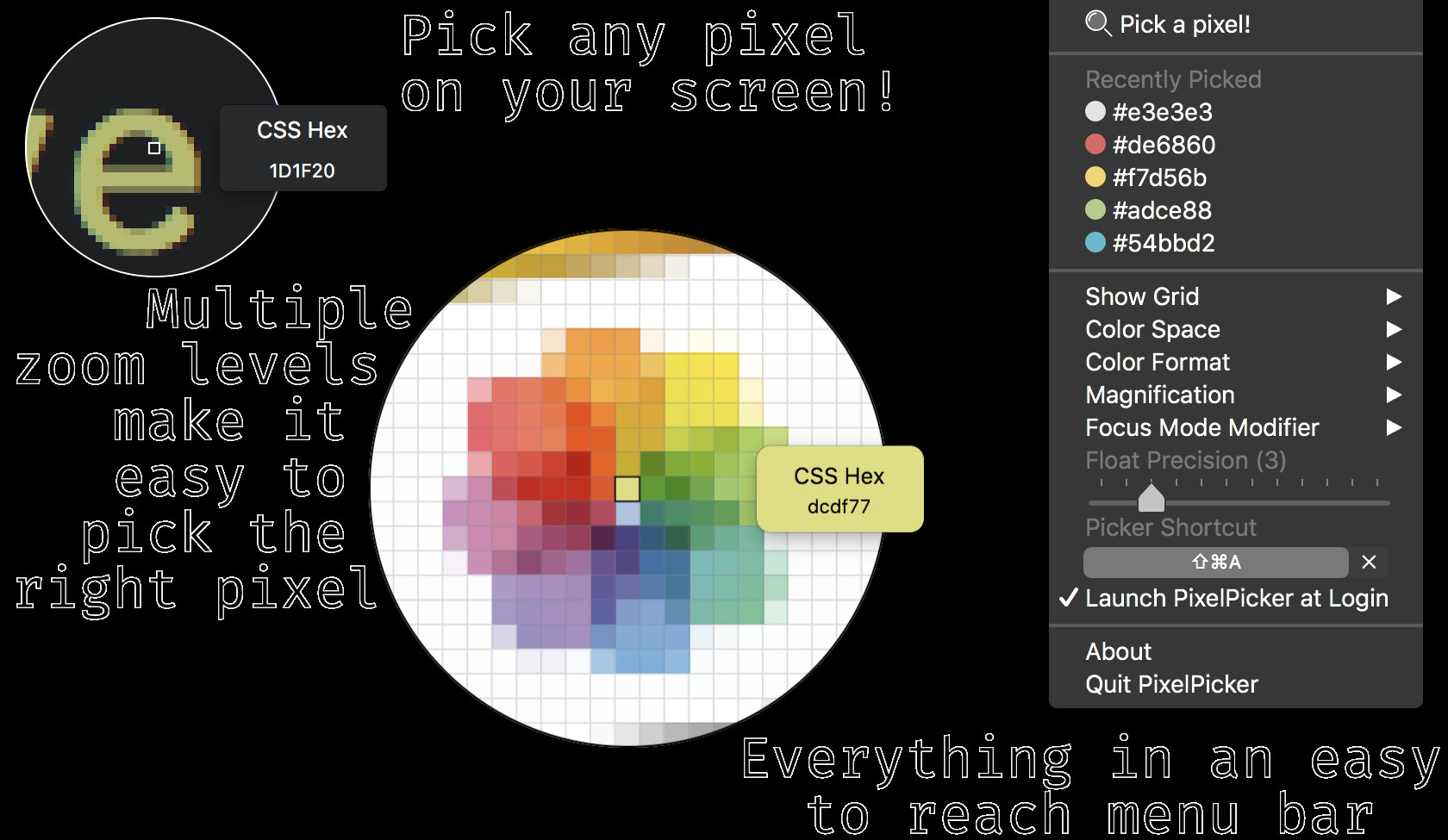 Pixel Picker for Mac je užitečná pomůcka pro macOS sloužící pro identifikaci barevných odstínů přímo z obrazovky. Uživatel má k dispozici lupu pro přiblížení vybrané oblasti pixelů a zvolený barevný odstín lze exportovat do barevných kódů typu RGB, HEX a dalších. Podporováno je ovládání pomocí klávesových zkratek.