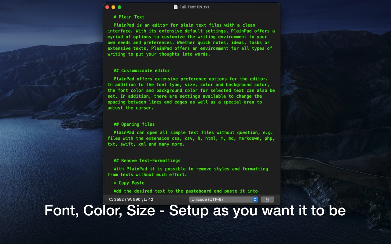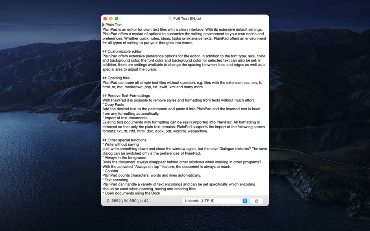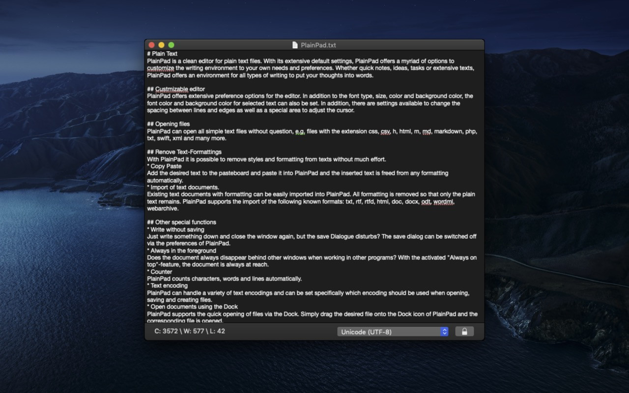 PlainPad for Mac je přehledný editor prostého textu pro počítače s macOS, který lze využít pro psaní poznámek, úkolů, nápadů, ale i rozsáhlejších textů. V editoru lze nastavit velikost a typ písma, barvu pozadí a další vizuální prvky.