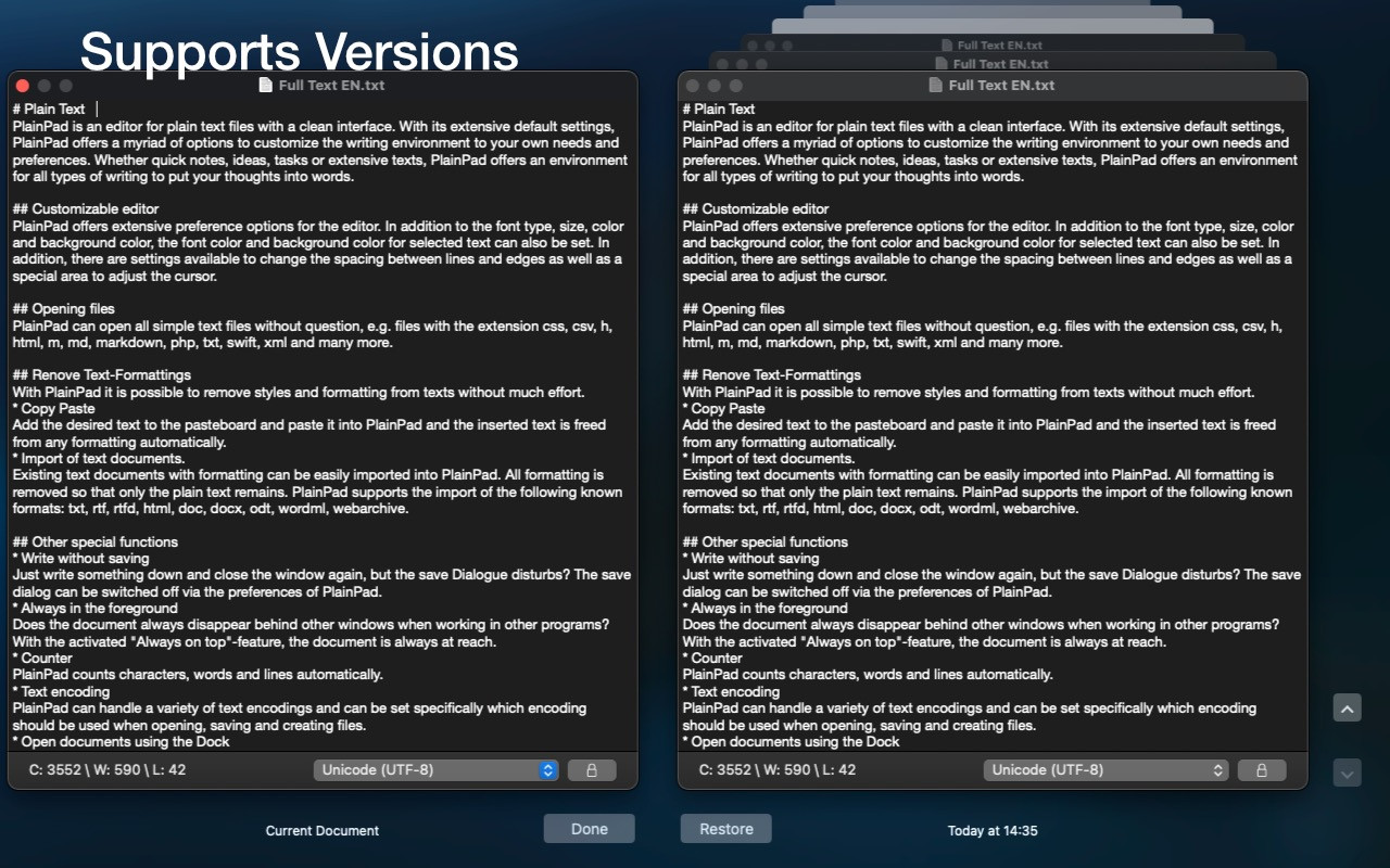 Lze rovněž importovat a odstraňovat formátování z textových dokumentů typu TXT, RTF, HTML, DOC/DOCX, ODT a dalších. Editor automaticky počítá znaky, slova a řádky. Podporován je režim celé obrazovky.