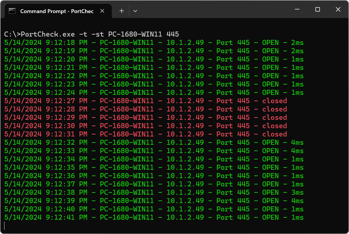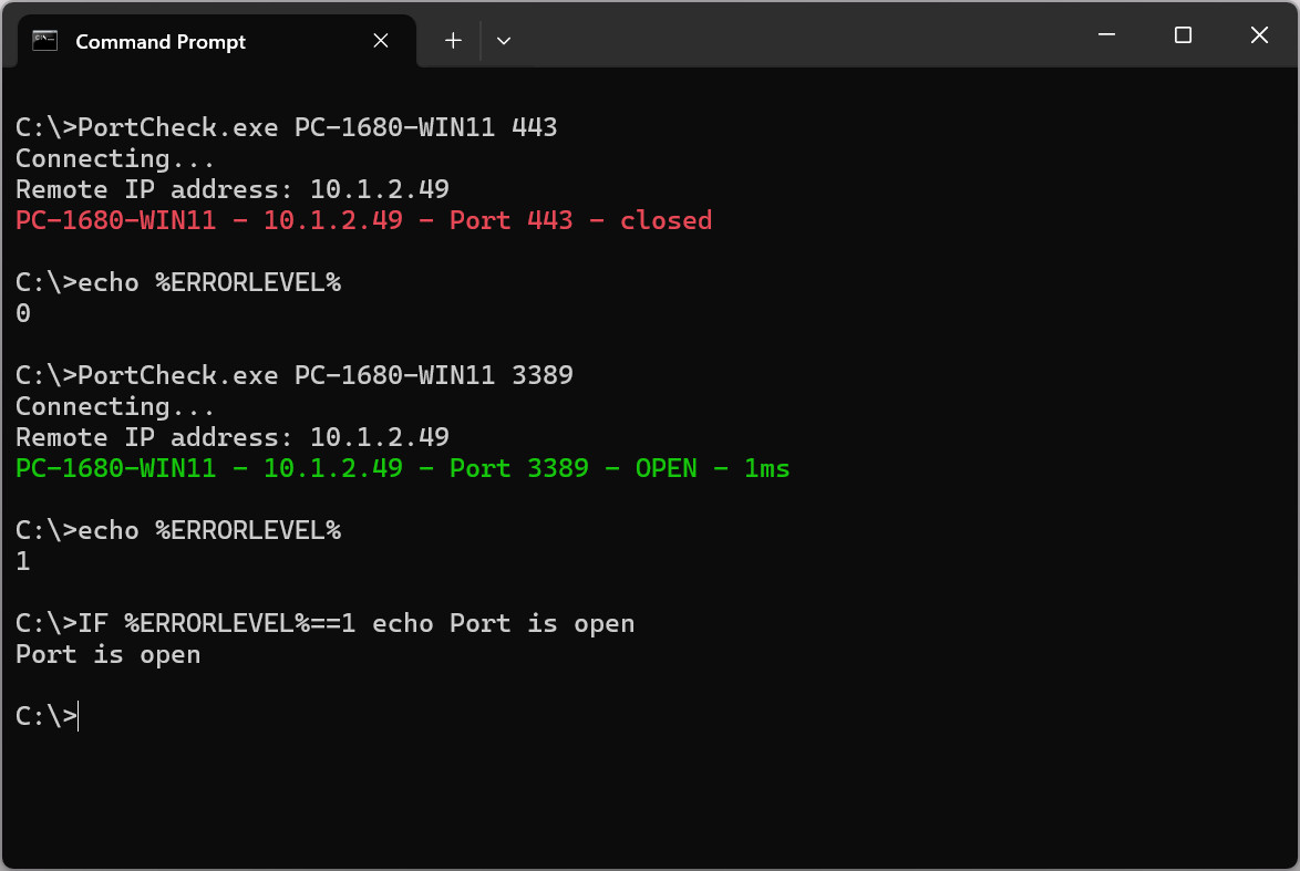 PortCheck je nástroj ovládaný pomocí příkazového řádku (CLI), který dokáže zkontrolovat, zda vzdálené zařízení odpovídá na určitém TCP portu. Nástroj pak zobrazí výsledek (dosažitelné / nedosažitelné) zeleně nebo červeně - včetně doby odezvy. Dalšími užitečnými funkcemi je například možnost logování do textového souboru, e-mailové upozornění nebo zvukovým výstupem.