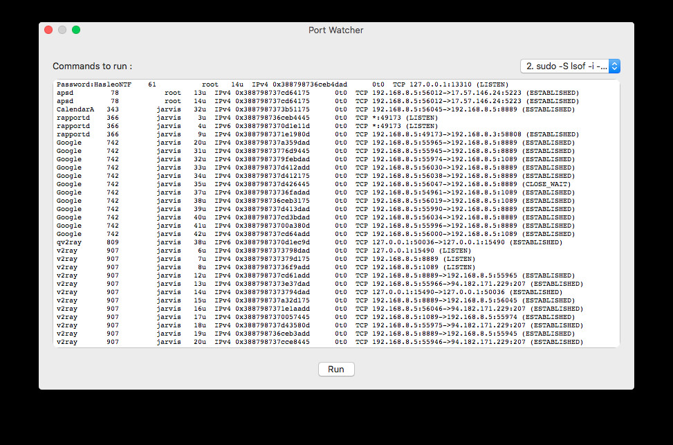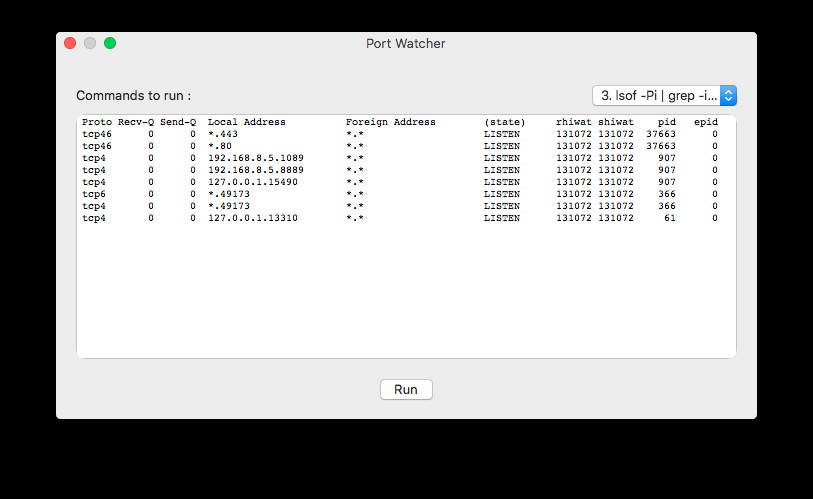 portWatcher for Mac je jednoduchá pomůcka sloužící pro zjištění a kontrolu právě používaných komunikačních portů v macOS. Seznam portů je zobrazen v přehledné tabulce, kde jsou uvedeny informace jako například označení portu, IP adresa a další informace související s konkrétní komunikací.