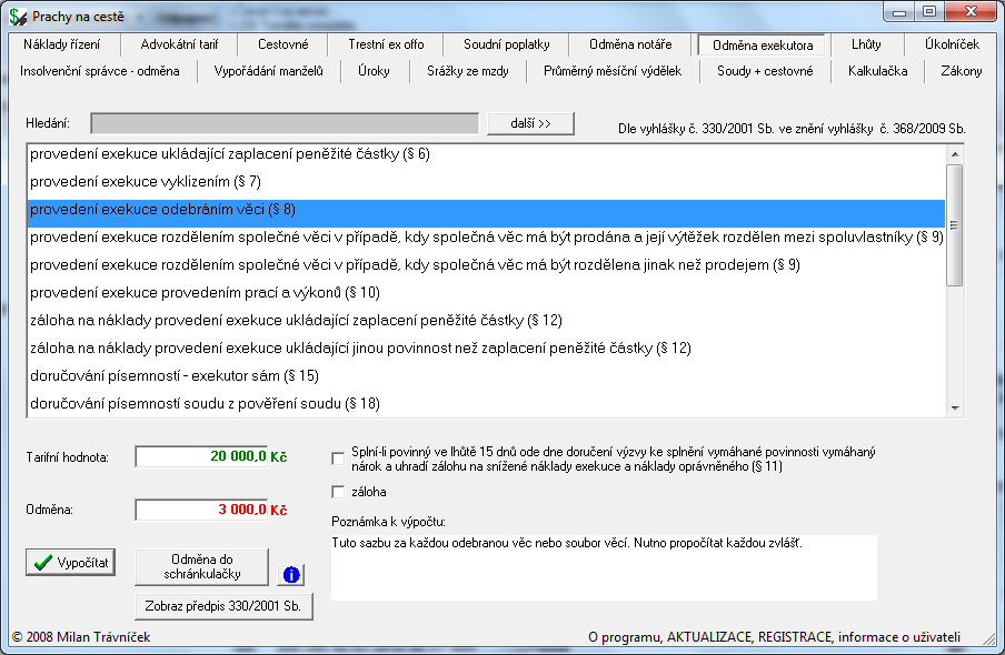 Tato advokátní kalkulačka dále vypočítává soudní poplatky dle zákona č. 549/1991 Sb. Nechybí ani propracovaný výpočet cestovného.