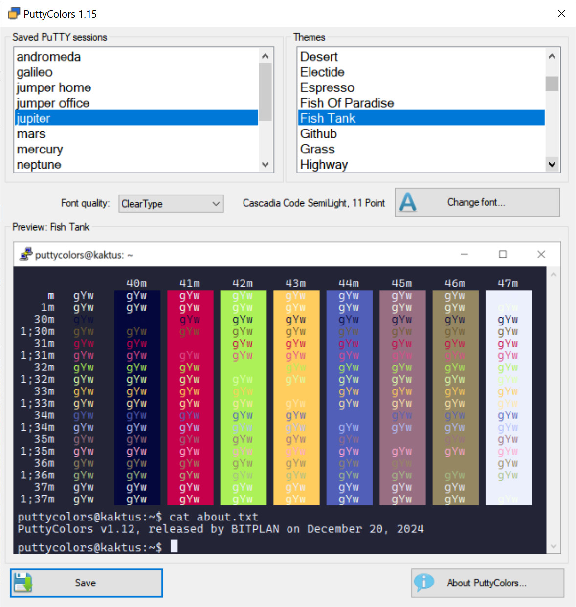 PuttyColors je pomůcka pro detailní úpravu vzhledu terminálu PuTTy. Uživatel má k dispozici více než 50 připravených barevných schémat, fontů a možné je jednoduché přepínání motivů. Možné je přizpůsobení písma pro lepší čitelnost a také zobrazení náhledu úprav vzhledu v reálném čase.