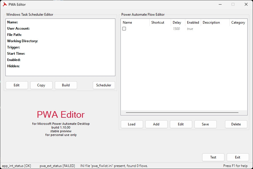 PWA Editor je nenáročný editor, který umožňuje vytvářet, upravovat a spravovat lokální automatizační workflow pomocí jednoduché INI konfigurace. Editor nabízí rychlé spouštění Power Automate Desktop skriptů, podporuje plánovače úloh a umožňuje offline provoz bez závislosti na cloudu. Editor není potřeba instalovat.