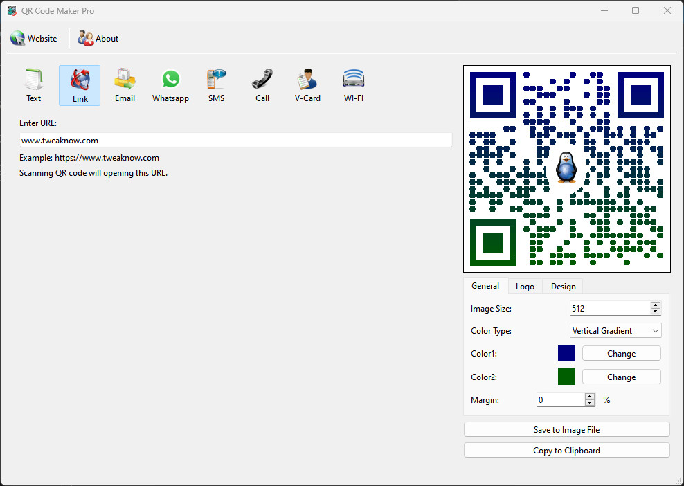 QR Code Maker je jednoduchý pomocník pro tvorbu a vygenerování QR kódů s různými druhy informací. Vytvořené QR kódy mohou obsahovat text, URL odkaz, e-mailovou adresu, telefonní kontakt (vizitku), heslo pro připojení k Wi-Fi apod. QR kódy je možné uložit do obrázku PNG.