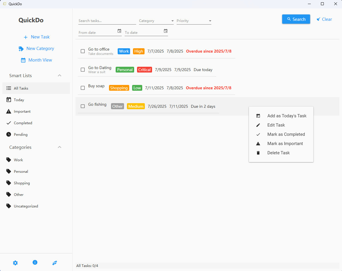 QuickDo nabízí všechny funkce potřebné pro třídění, přiřazení priority a vizualizaci úkolů. K dispozici jsou rovněž inteligentní systém kategorií, chytré náhledy seznamů úkolů nebo pokročilý plánovací kalendář.