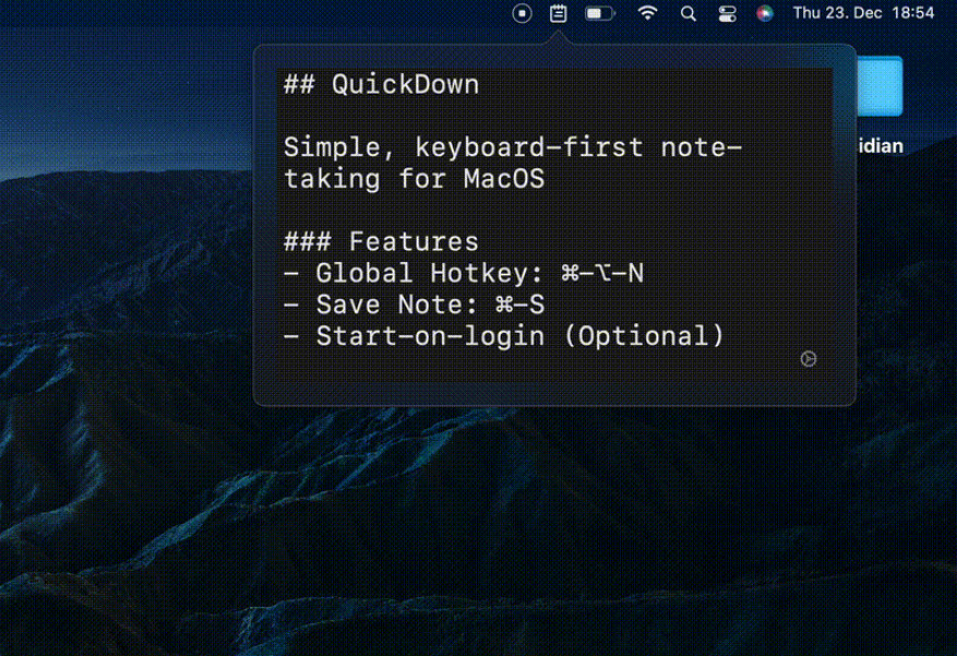 QuickDown for Mac je aplikace pro pohodlné a rychlé zapisování poznámek v Markdown formátu. Program se ovládá přímo z oblasti menu baru v macOS. Podporováno je ovládání programu pomocí klávesových zkratek, jejichž pomocí lze otevřít okno editoru a uložit rozepsané poznámky do souboru na disk.