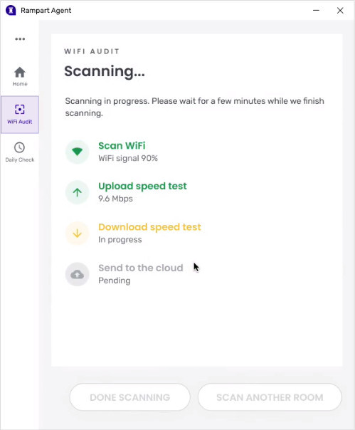 Rampart Agent je nástroj, který dokáže důkladně analyzovat domácí bezdrátovou wi-fi síť a dokáže odhalit různé problémy a zároveň i pomáhá s jejich opravou. Program dokáže zjistit dostupnost signálu analyzované wi-fi sítě, změří rychlost stahování i uploadu a odešle testovací data na cloudové úložiště.