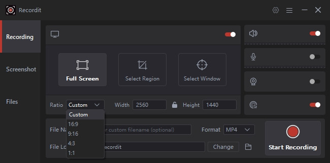 Recordit si poradí se zaznamenáváním obrazovky, webkamery, systémového zvuku nebo zvuku z mikrofonu. Nabízí také vytváření statických snímků celé obrazovky nebo jen její vybrané části.