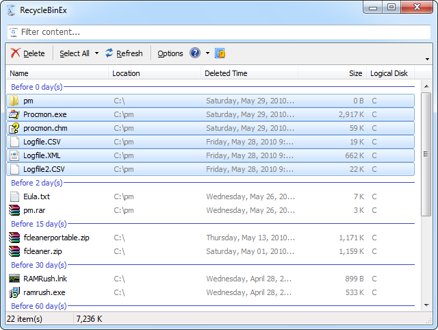 RecycleBinEx je pomůcka, která rošiřuje některé funkce a vlastnosti klasického koše ve Windows. U všech souborů je patrný čas a datum smazání a také disková jednotka, ze které byl soubor odstraněn. Samozřejmostí je vyhledávání souborů v koši, jejich případné obnova atd. Pro snadnější ovládání se program také integruje do kontextové nabídky koše.
