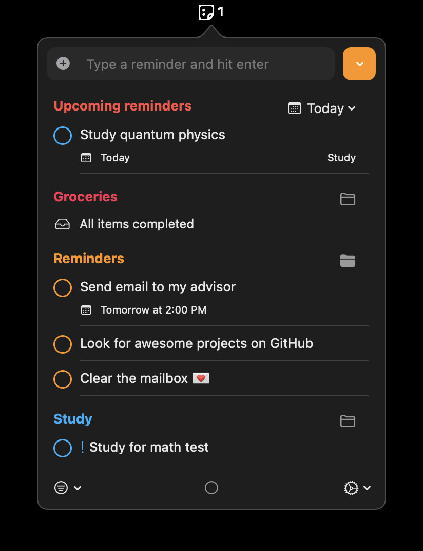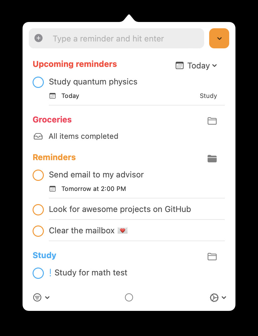 Reminders Menu Bar for Mac je nástroj sloužící pro přehlednou správu různých úkolů a upomínek přímo z oblasti menu baru v macOS. Veškerá data jsou synchronizována se službou Reminders od fy. Apple. Podporováno je vytváření nových připomínek, značení připomínek za aktivní či dokončené, přesouvání připomínek nebo třídění připomínek podle stavu nebo seznamu, do něhož jsou zařazeny.