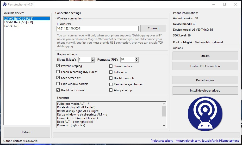 Remotephone je aplikace, která je určená především pro Android vývojáře a která nahrazuje standardní Android Emulator. Aplikace je založena na scrcpy a Android Debug Bridge.