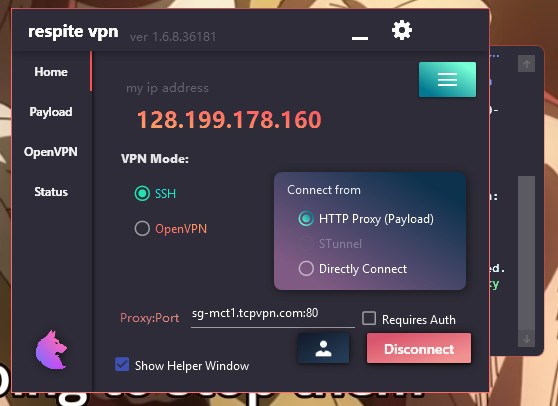 respite vpn je systémově nenáročný SSH a OpenVPN klient, který umožňuje uživateli bezpečné připojení k Internetu s pomocí vlastních "injektovaných" HTTP Proxy hlaviček. Klient nabízí tisíce SSH VPN poskytovatelů, podporuje export a import konfiguračních souborů a nevyžaduje administrátorská oprávnění.