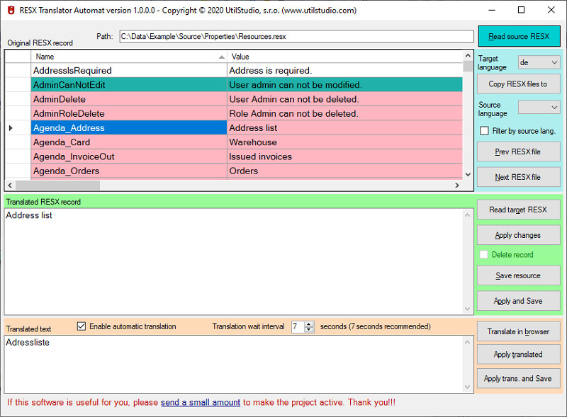 Program umožňuje automatický preklad RESX súborov do iného jazyka. Viac sa dozviete na stránkach produktu.