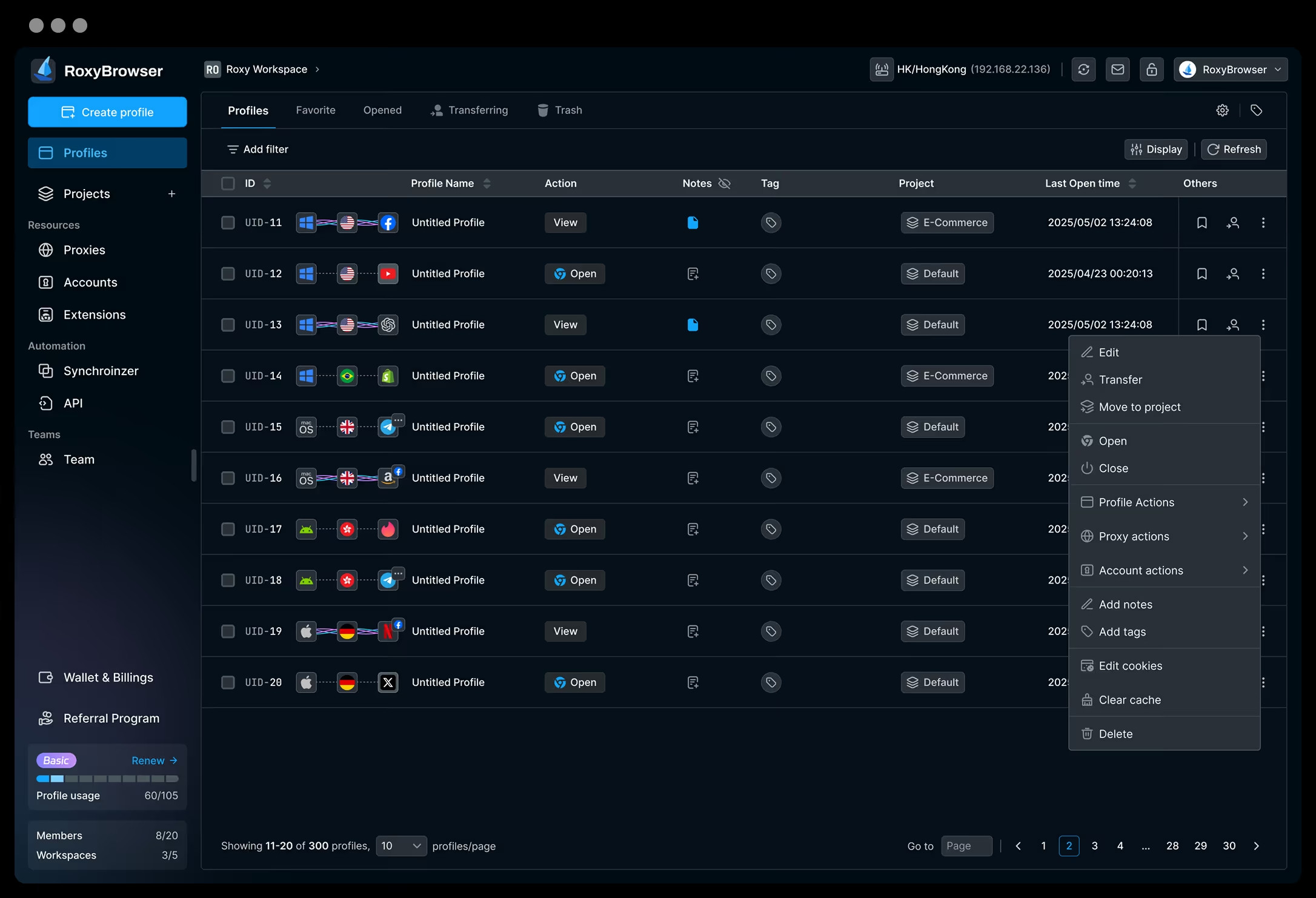 RoxyBrowser automaticky upravuje více než 160 různých parametrů digitálního otisku (např. geolokace, operační systém, typ prohlížeče) pro každý profil, čímž prohlížeč zajišťuje ochrnu soukromí uživatele a minimalizuje riziko detekce nebo blokace účtů.