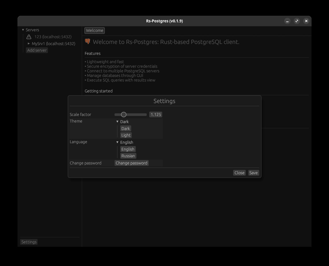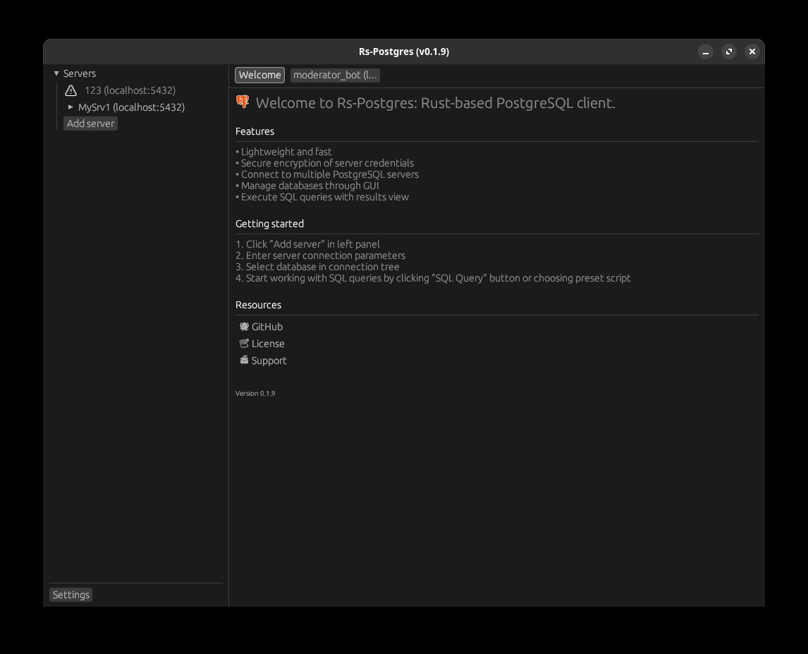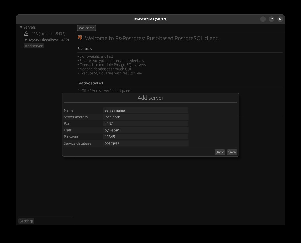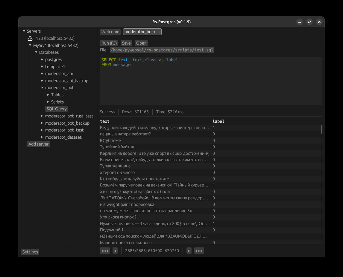 Rs-Postgres je moderní klient sloužící pro správu databází typu PostgreSQL. Klient umožňuje tvorbu a spouštění SQL dotazů s okamžitým zobrazením výsledků v přehledných tabulkách. Uživatel může snadno procházet databáze, tabulky a další objekty ve stromové struktuře. Možné je připojení k více PostgreSQL serverům a spravovat lze tak i více databází současně.