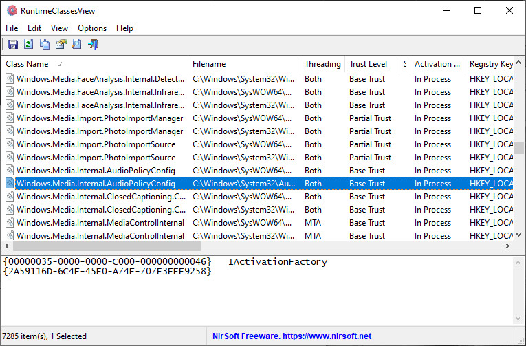 RuntimeClassesView je nástroj, který dokáže zobrazit seznam Windows Runtime (WinRT) tříd nainstalovaných ve Windows. Pro každý záznam program vypisuje i detailní informace jako jsou například název třídy, název souboru, threading, trust level, server, typ aktivace, klíč registru, CLSID a další.