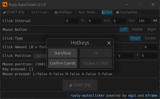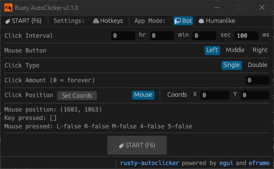 Rusty AutoClicker je nenáročný nástroj umožňující nastavit automatické klikání myší. Uživatel snadno definuje simulované tlačítko (levé, střední či pravé), typ kliknutí (kliknutí či dvojklik), počet kliknutí a pozici kurzoru myši na obrazovce. Program není potřeba instalovat.