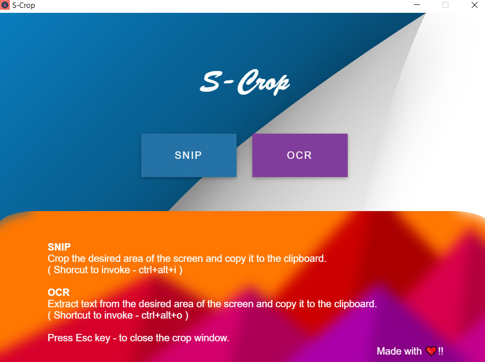 S-Crop je aplikace pro snímání obrazovky a také pro rozpoznávání textu pomocí technologie OCR. Pomocí klávesové zkratky Ctrl+Alt+I program umožňuje vybrat část obrazovky a snímek zkopírovat do schránky.