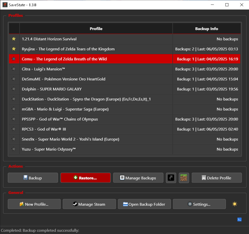 SaveState je nástroj určený pro přehlednou správu a zálohování uložených pozic v různých hrách s automatickou detekcí Steamu a podporou hry Minecraft. Zálohování je prováděno do komprimovaných ZIP archivů. Uživatel si může sám nastavit počet záloh na profil, úroveň komprese a kontrolu volného místa na disku.