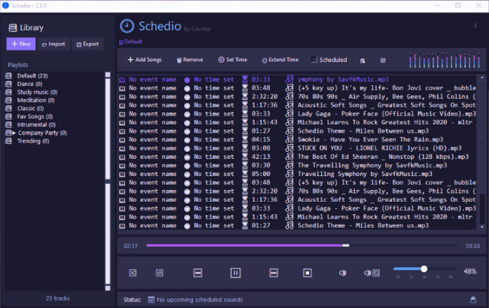 Schedio je audio přehrávač, který je doplněn o možnost pokročilého plánování času spouštění hudby, což lze využít například při prezentacích nebo různých rutinních činnostech.