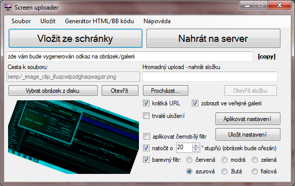 Screen Uploader je nástroj pro snadné nahrávání screenshotů a obrázků na server během několika sekund. Vhodné pro začátečníky i pokročilé, "vyfotíte" obrazovku tlačítkem PrintScreen na klávesnici a v našem programu kliknete na tlačítko, obrázek se zpracuje a nahraje se jeho náhled i plná velikost obrázku na náš server. Nově je možnost nahrání obrázku z počítače, PŘÍPADNĚ CELÉ SLOŽKY S OBRÁZKY.