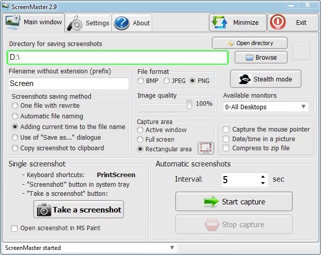 ScreenMaster je pokročilá aplikace pro manuální nebo automatické snímání obrazovky a ukládání vytvořených snímků obrazovky. Snímky obrazovky je možné pořizovat a ukládat automaticky i ve skrytém režimu bez vědomí uživatele.