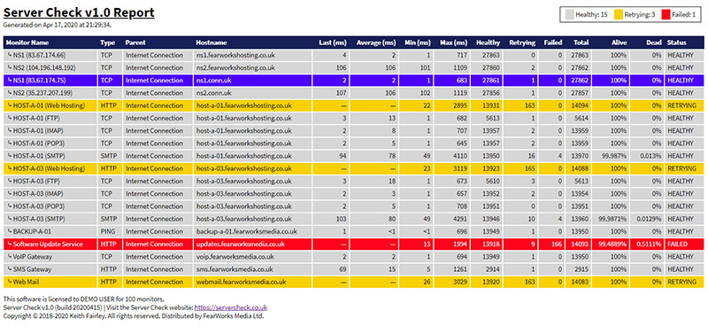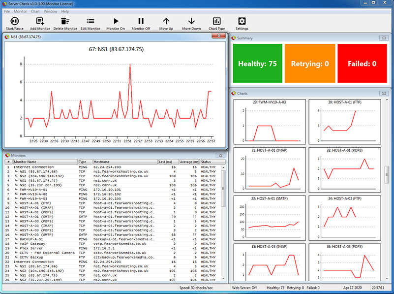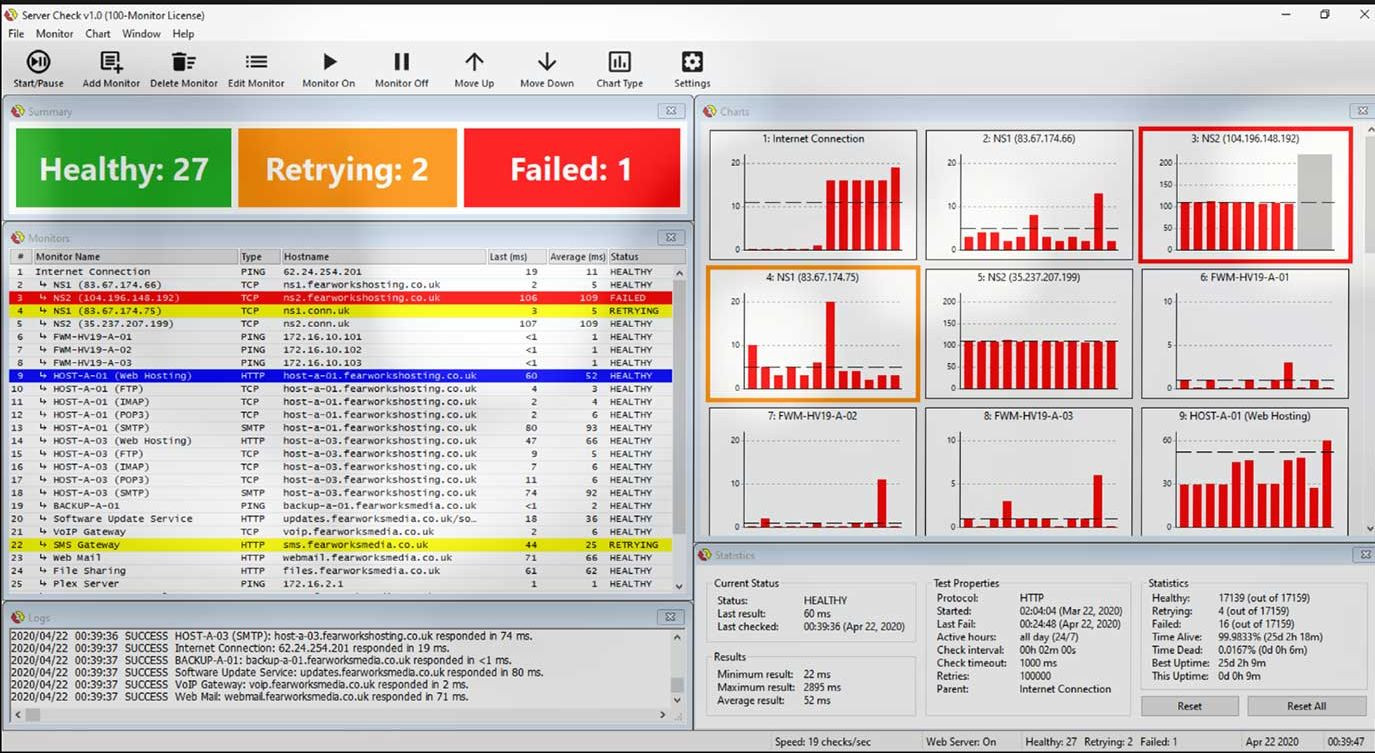 Server Check je nástroj pro monitorování dostupnosti serverů respektive různých internetových služeb. Sledovat lze například servery typu SMTP, IMAP, FTP, TCP, MySQL, POP3 a další. Nechybí samozřejmě ani podpora příkazu PING. V případě výpadku sledovaného serveru je uživatel upozorněn Pop-up oknem, audio signálem, e-mailem nebo SMS zprávou. Nechybí ani přehledné grafické zobrazení doby odezvy nebo reportu výpadků.
