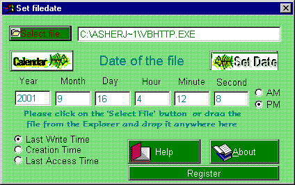 Set Filedateje jednoduchá pomůcka pro snadnou změnu data a času vytvoření nebo poslední editace nebo přístupu k souboru. Program má velmi snadné ovládání, přehledné rozhraní a nevyžaduje instalaci.