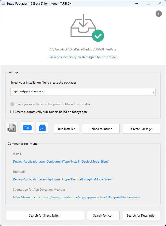 Setup Packager Intune dokáže vytvořit balíček kompatibilní s PSADT (PowerShell App Deployment Toolkit) ze souborů a ihned jej otestovat. Uživatel pouze přetáhne složku s instalačním souborem nebo soubory do okna programu a vybere typ instalátoru EXE, MSI nebo instalační skript.