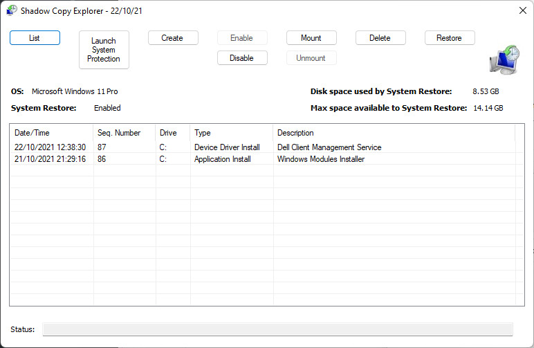 Shadow Copy Explorer je nástroj pro připojení (mountování) a procházení bodů obnovy systému nebo stínových kopií / předchozích verzí systémů Windows Vista, 7, 8, 10, Server 2008. Program pomáhá obnovovat soubory bez nutnosti provedení kompletní obnovy. Nabízí rovněž možnost pro odstranění bodů obnovení, vytváření bodů obnovení nebo zobrazení údaje, kolik místa na disku zabírají body obnovení a stínové kopie.