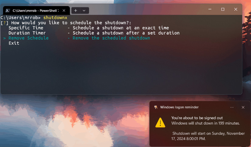 ShutdownX je pomůcka ovládaná pomocí příkazového řádku (CLI), která je určena pro plánované automatické vypnutí počítače v nastavený čas nebo po uplynutí zadané doby. Program nabízí také interaktivní režim, který uživatele provede celým procesem naplánování vypnutí.
