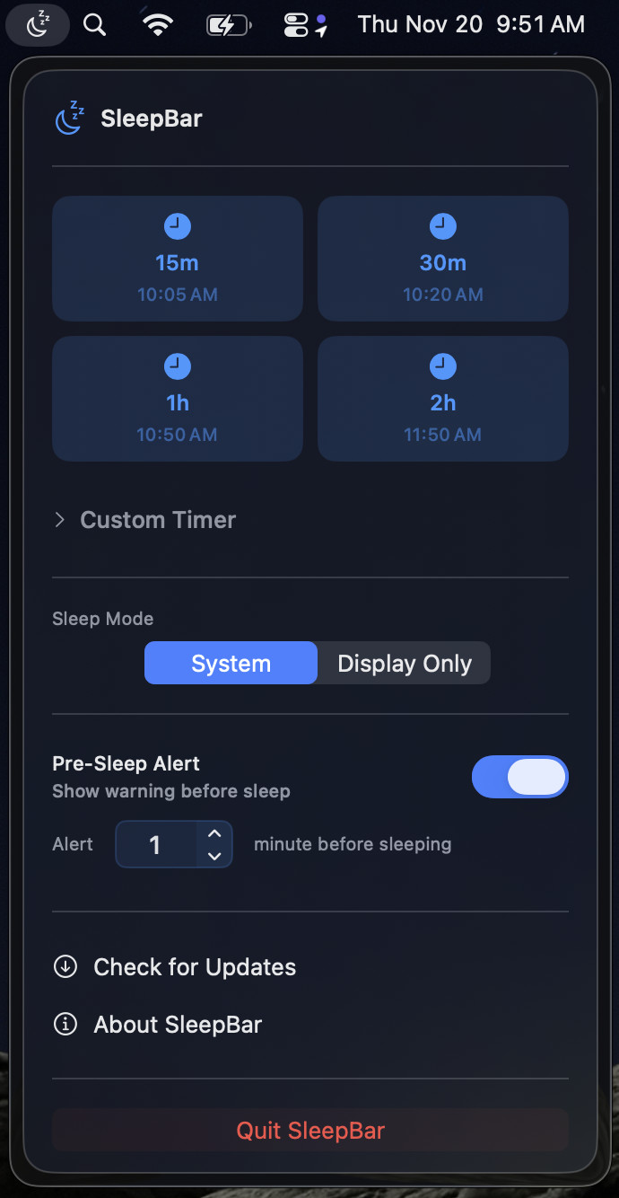 SleepBar for Mac je jednoduchá pomůcka pro menu bar sloužící pro automatické uspání počítače s macOS v předem stanovený čas nebo po uplynutí zadané doby. Upsat je možné pouze obrazovku nebo celý systém. Před samotným uspáním je zobrazeno upozornění.
