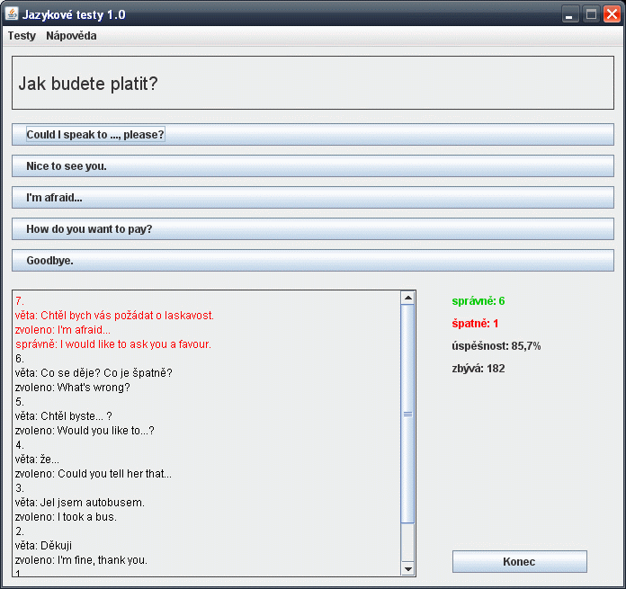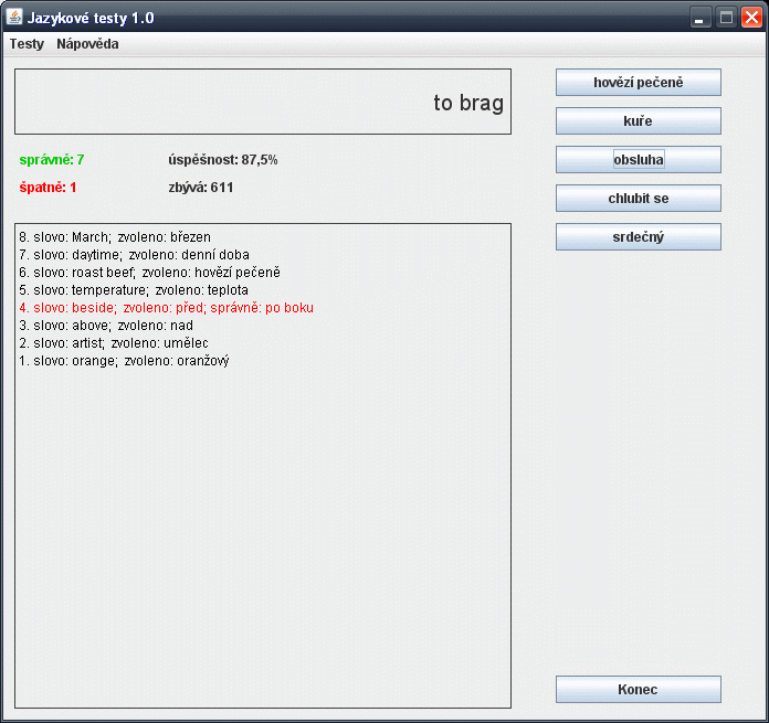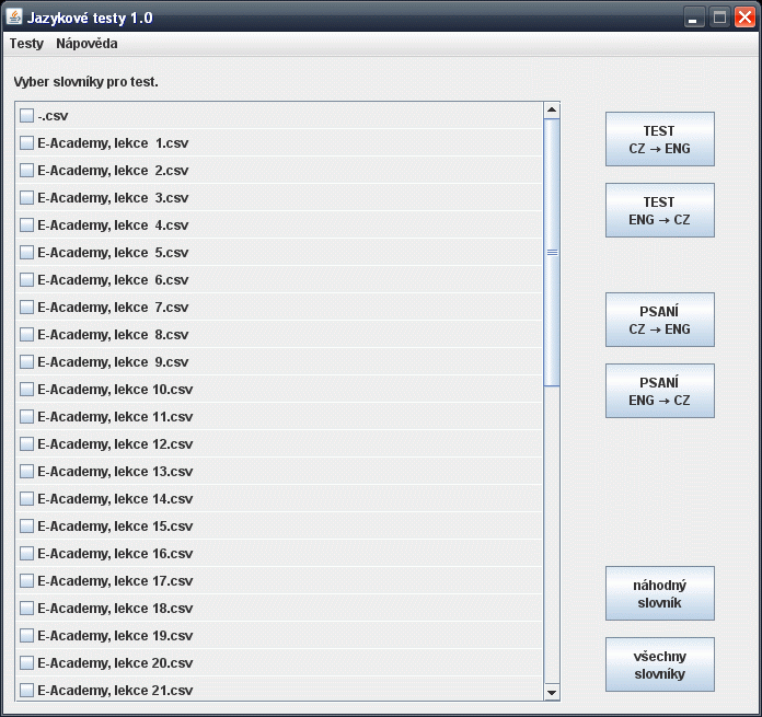 Jedná se o předělávku programu \"Slovní zásoba\". Jako jeho předchůdce i tento program je určen k prozkoušení slovní zásoby. Také mu přibyla funkce, vlastně se jedná pouze o modifikaci testů slovíček, test překladů vět. Obsažené slovníky a věty vycházejí z kurzu E-Academy (neobsahuje zatím všechny lekce, ale pouze ty, ke kterým jsem se probojoval). Snad to autorům nebude vadit.